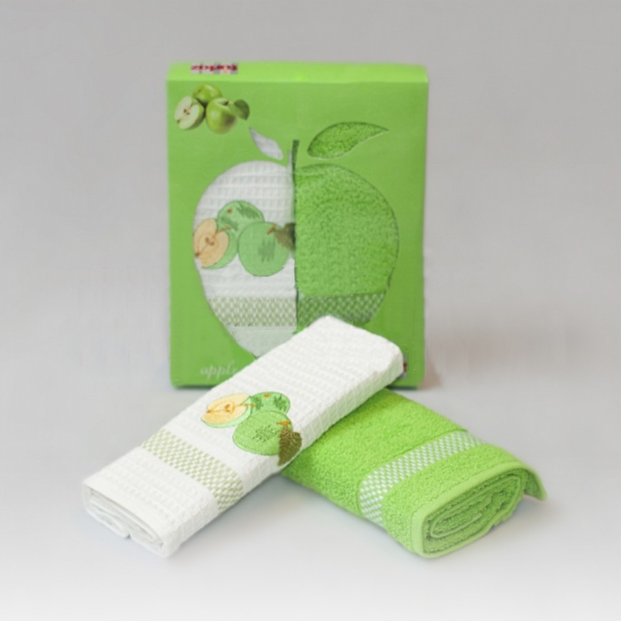 Utěrka s originální výšivkou jablka a ručník se stejnou bordúrou jsou laděné do krémové a oranžové barvy.